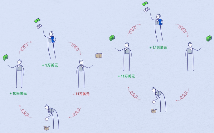 贷款人放贷,产生信贷—> 借款人获得贷款产生负债,增加支出—> 一个人的支出是另一个人的收入—> 一个人收入提供,信用增加,贷款人更愿意借钱给他—> 借贷增加—> 支出增加—> 另一个人的收入也增加—>….